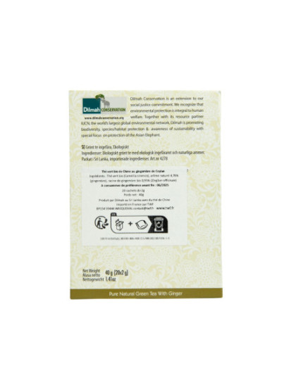 Ingrédients : Thé vert bio (Camellia sinensis), arôme naturel de gingembre (4,76%) et racine de gingembre bio (Zingiber officinale 0,95%)